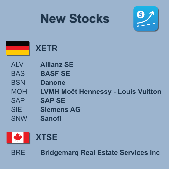We added following new European and Canadian stocks to the 22 Dividends app.